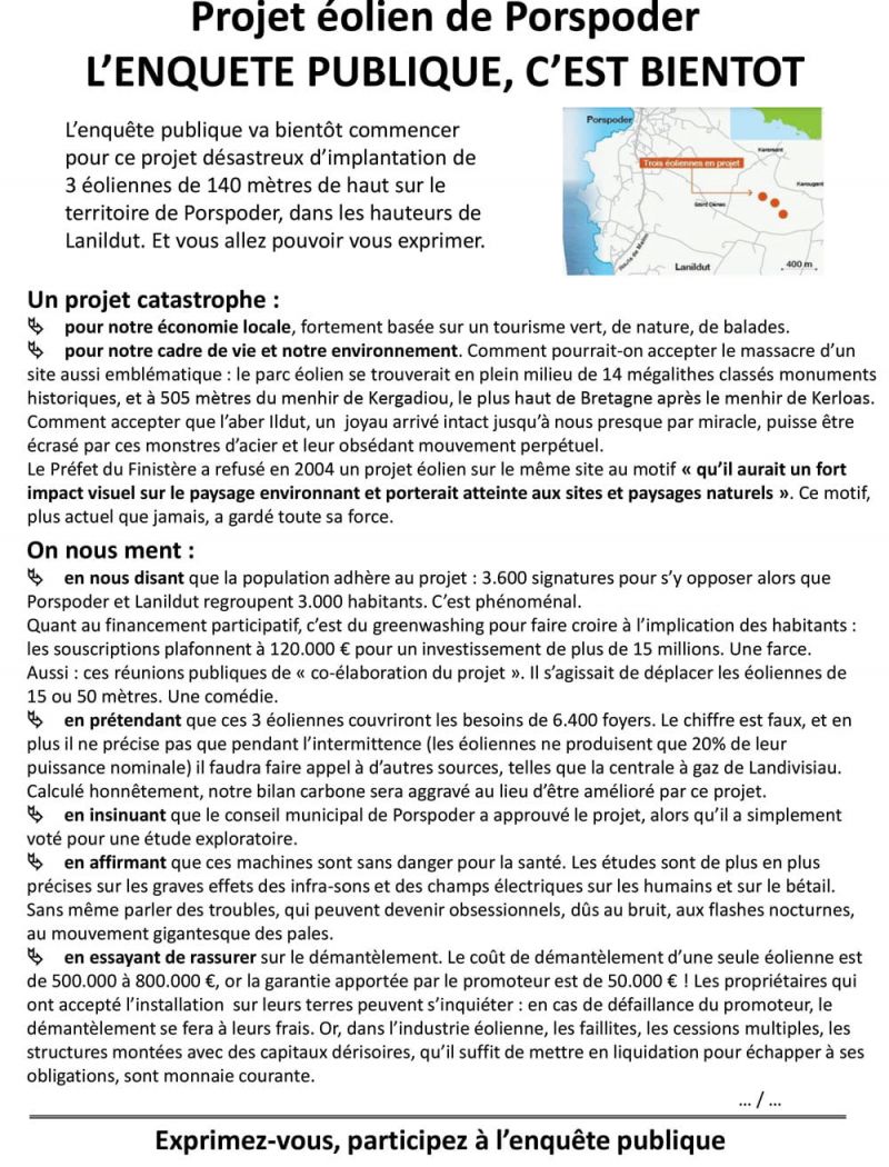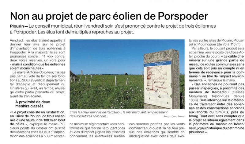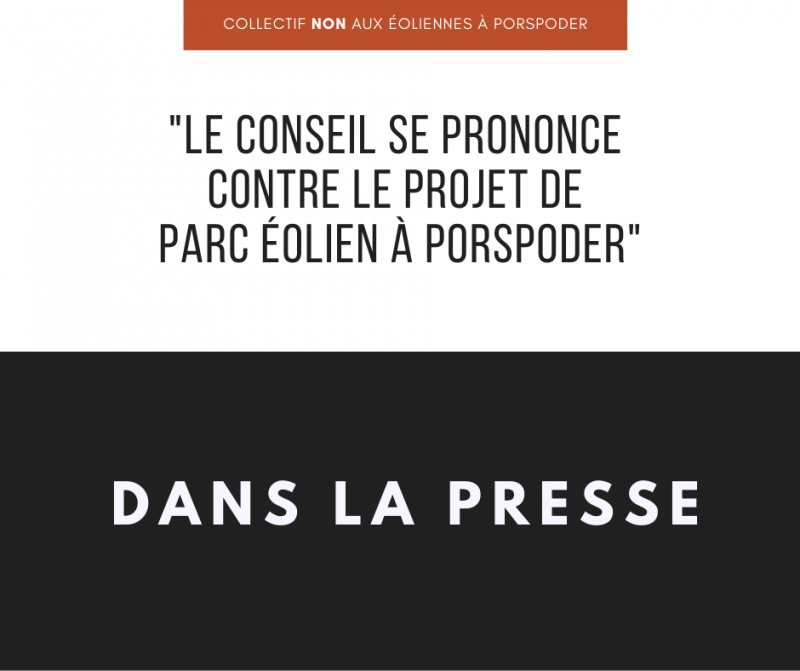"Le conseil se prononce contre le projet de parc éolien à Porspoder" 13 avril 2021 Le conseil de Plourin Ploudalmezeau s’est prononcé contre le projet, avec du bon sens. Merci à eux.À noter que le mât... Lire la suite