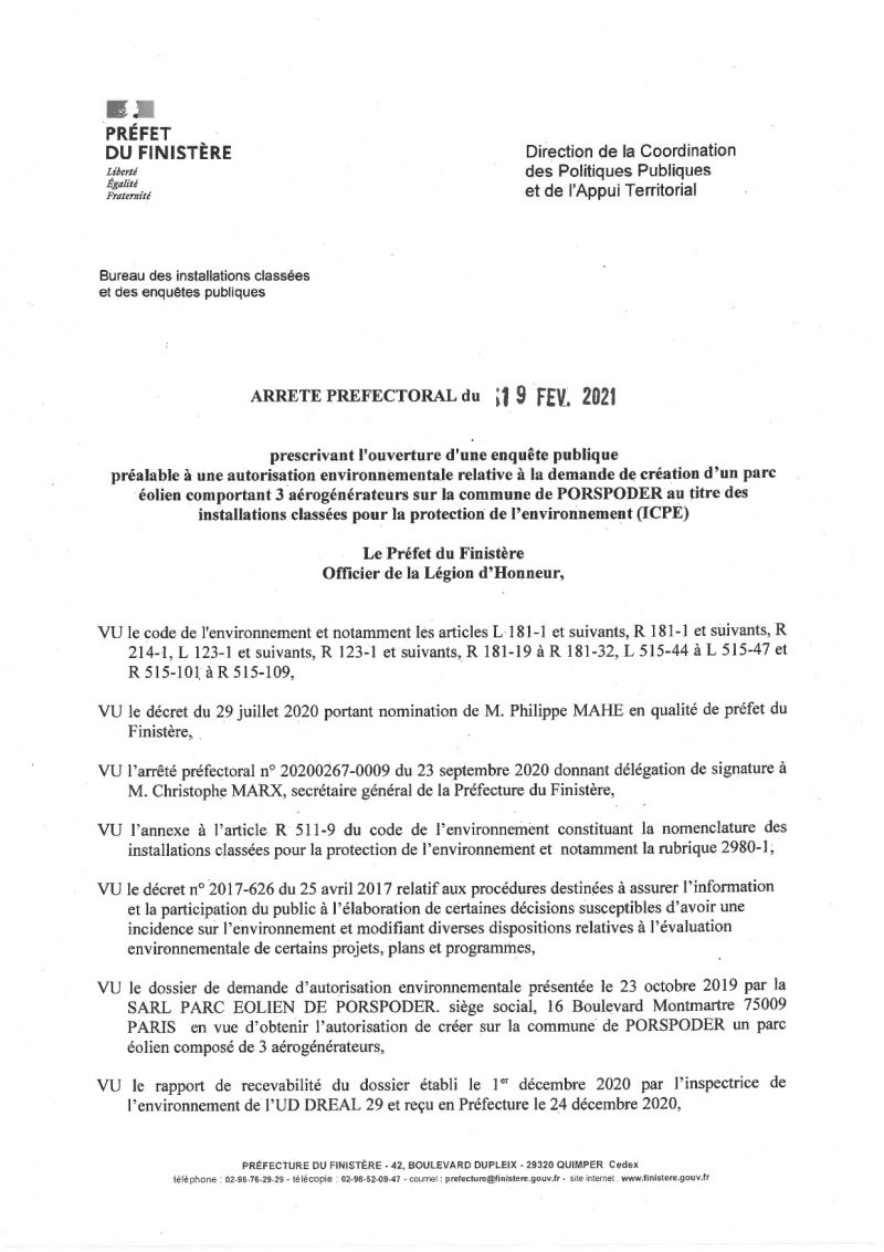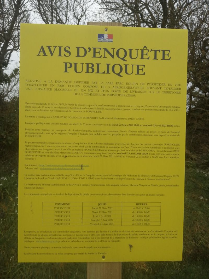 Projet éolien de Porspoder : l'enquête publique, c'est bientôt 22 février 2021 Attention, la Mairie de Porspoder va lancer une enquête publique et il est bien probable que la Mairie le fasse sans grande... Lire la suite