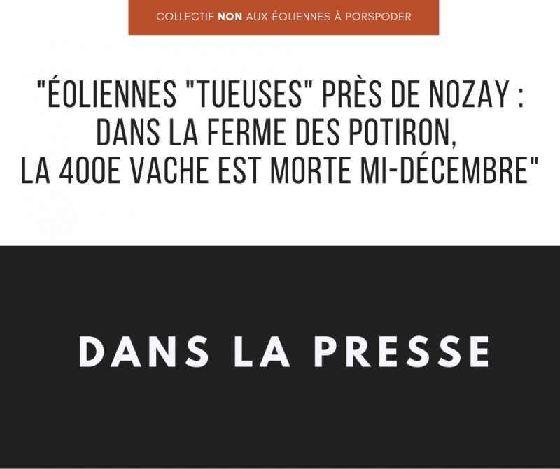 Éoliennes "tueuses" près de Nozay : dans la ferme des Potiron, la 400e vache est morte mi-décembre 12 janvier 2021 Les éoliennes tueuses ont encore frappé. La ruine et la détresse d’agriculteurs du 44. Lire la suite