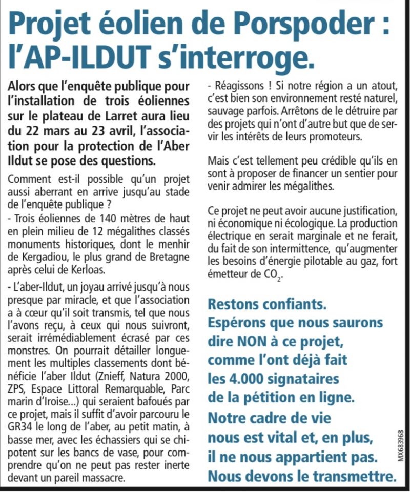 L'association pour la protection de l'Aber-Ildut se pose des questions 22 mars 2021 La très sérieuse association pour la protection de l’Aber-Ildut s’interroge sur le projet éolien de Porspoder, projet... Lire la suite